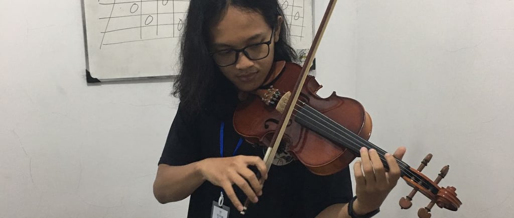 Pegang busur dengan benar dan latih gerakan menggesek senar secara perlahan.
