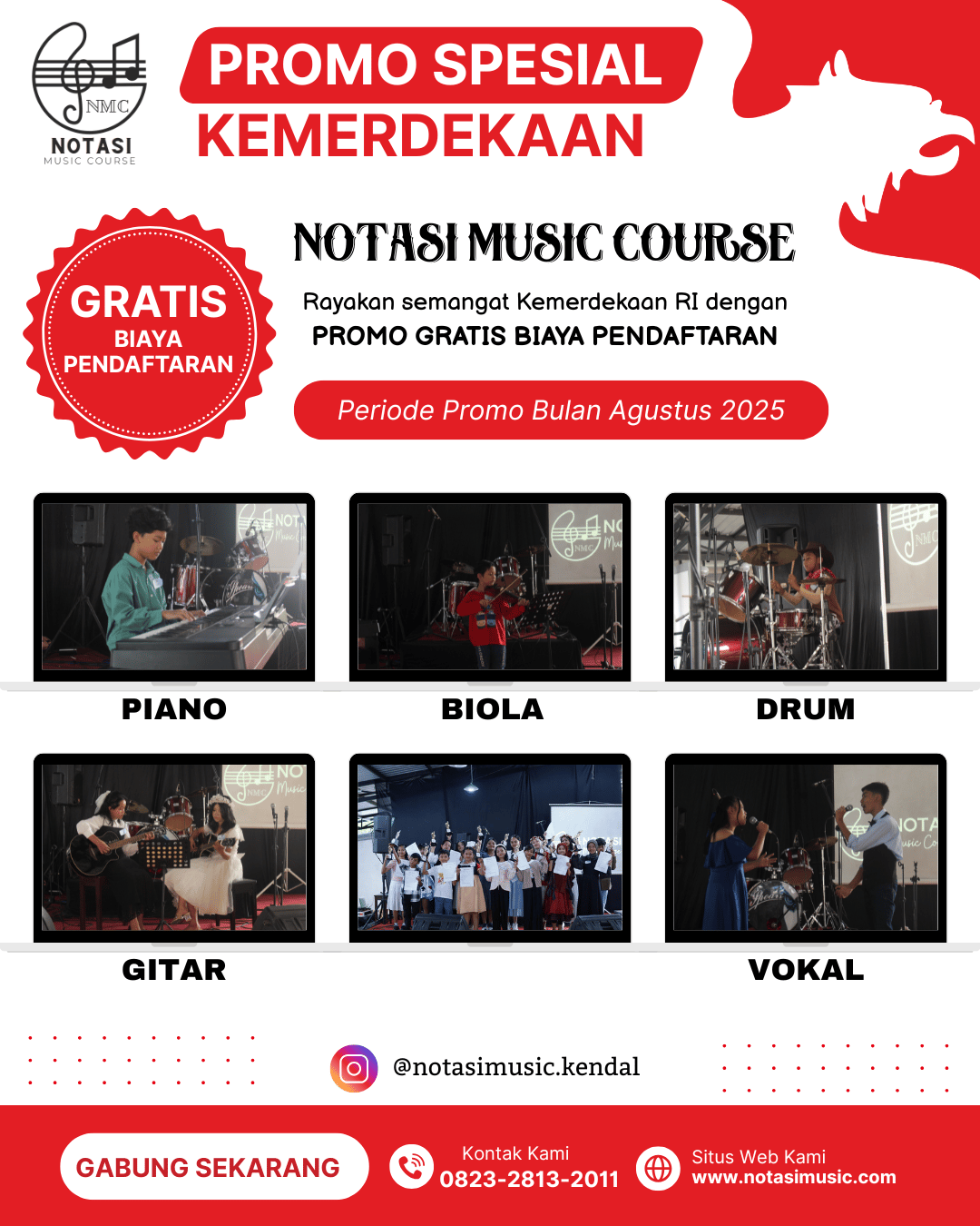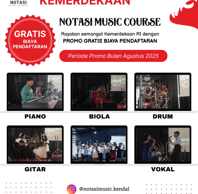 Sebagai salah satu lembaga pendidikan musik yang terus mendukung perkembangan seni dan kreativitas generasi muda, Notasi Music Course Kendal turut serta merayakan momen kemerdekaan ini dengan cara yang berbeda. Tahun ini, Notasi Music Course menghadirkan promo spesial HUT RI ke-80: GRATIS biaya pendaftaran untuk semua instrumen tanpa syarat apapun.